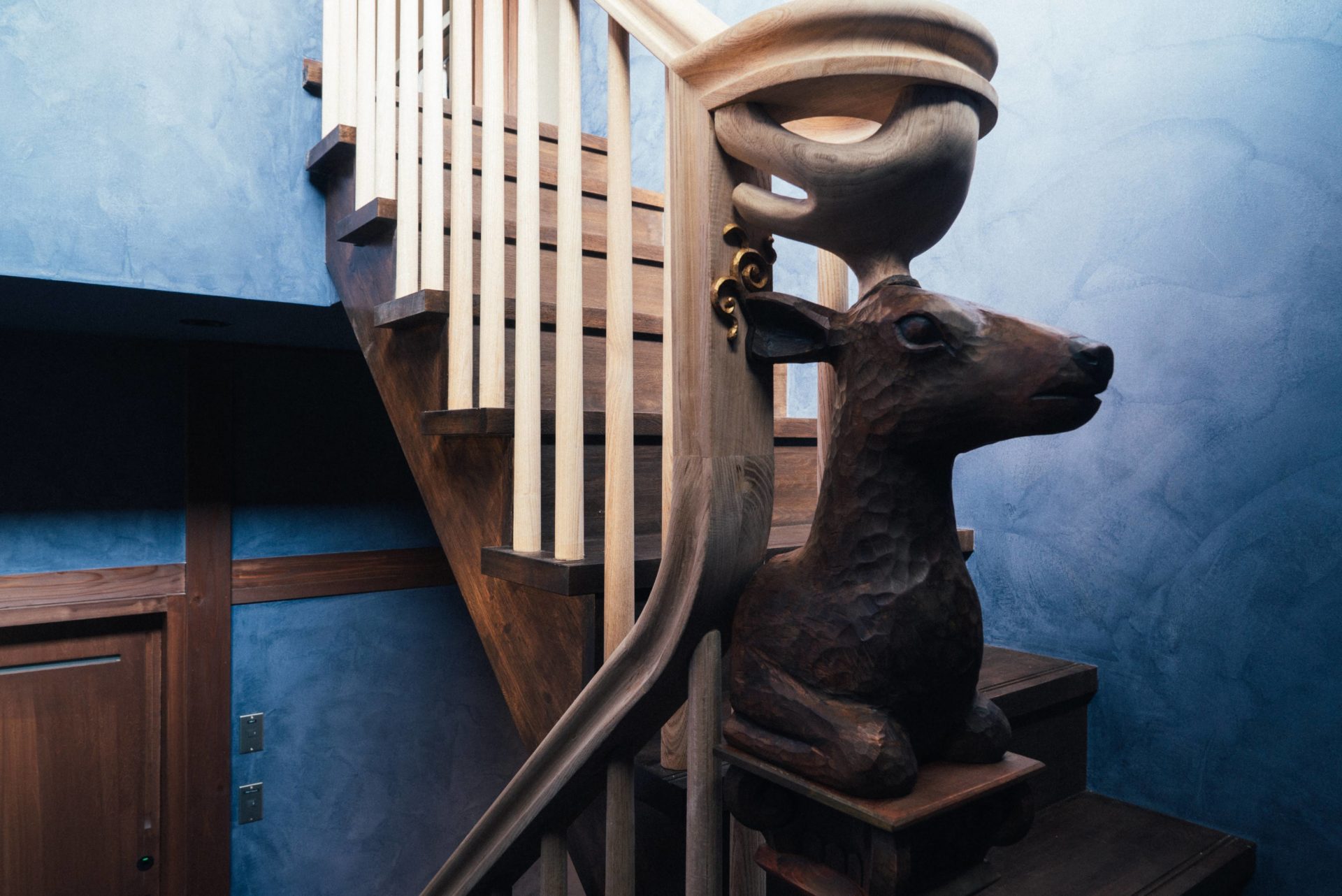 A wooden chandelier carved by Daichi Maekawa makes a striking presence.