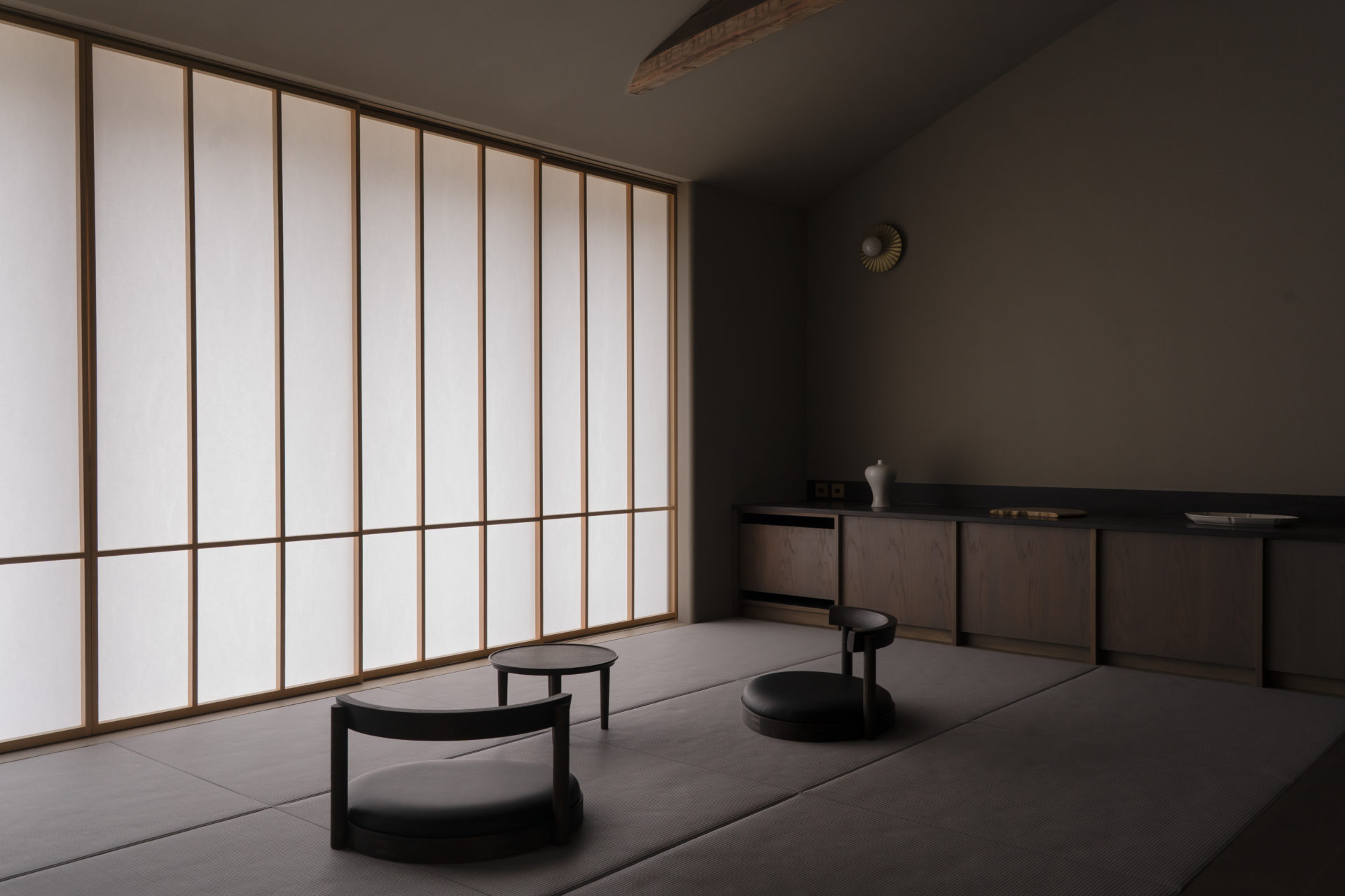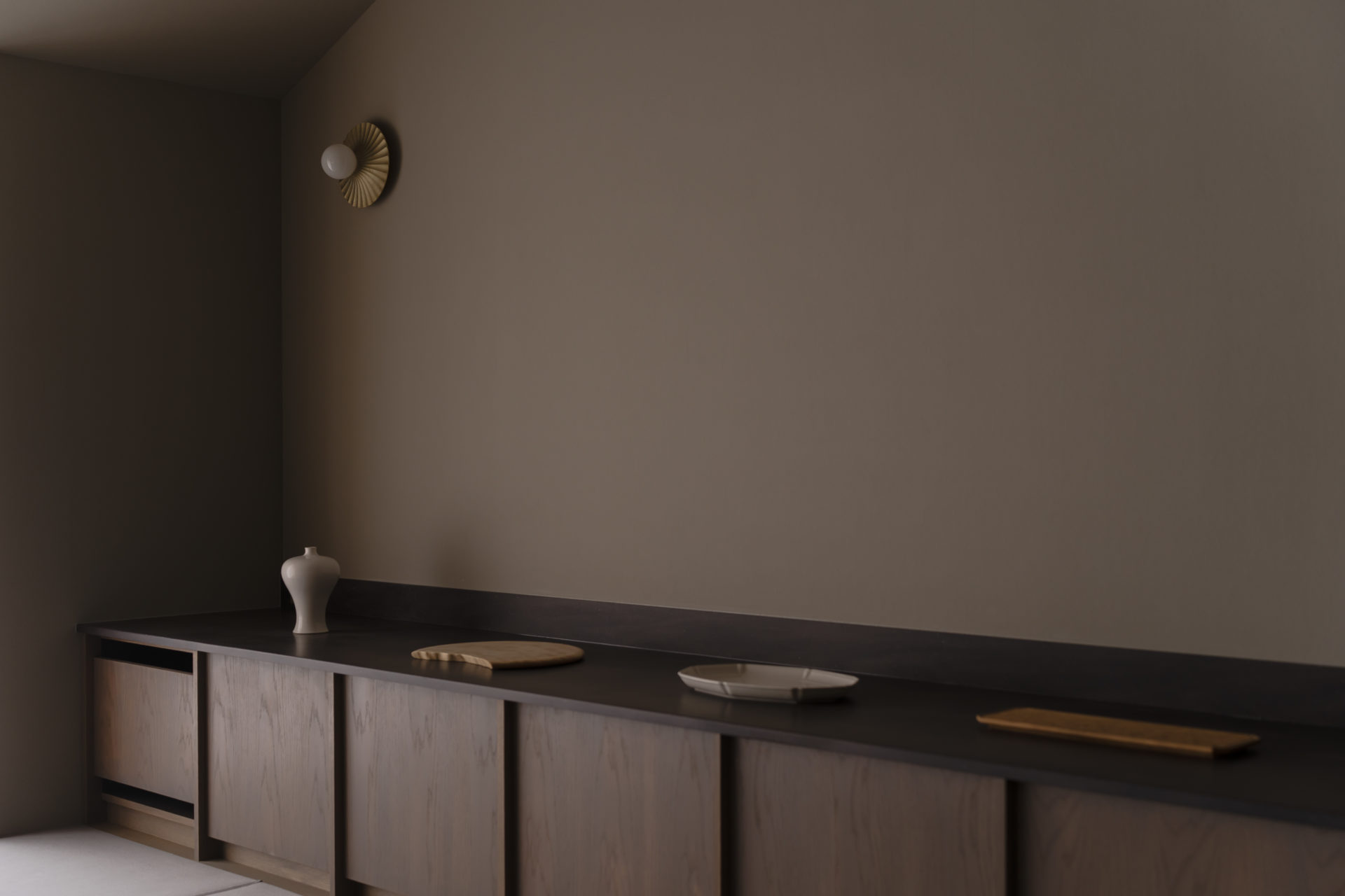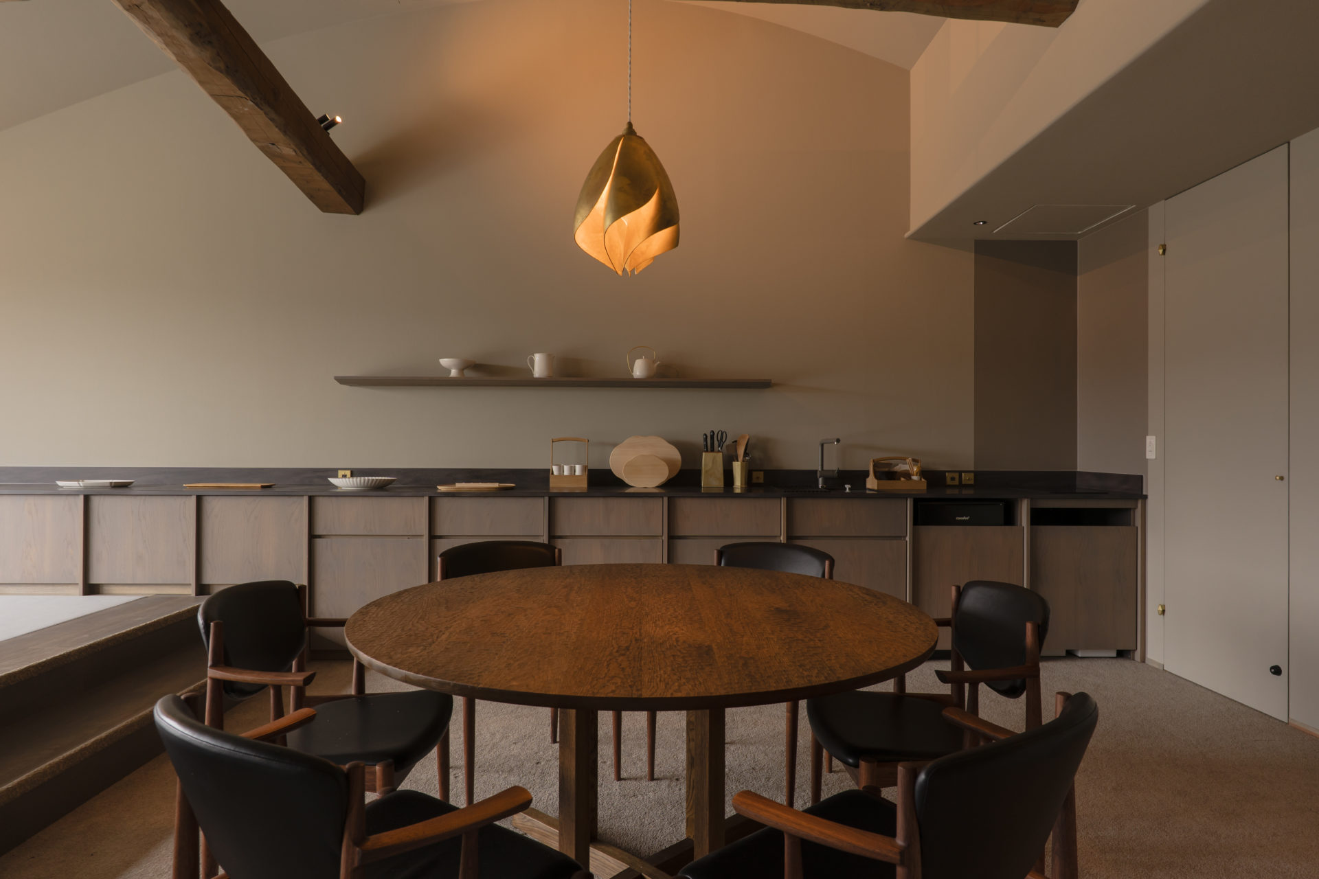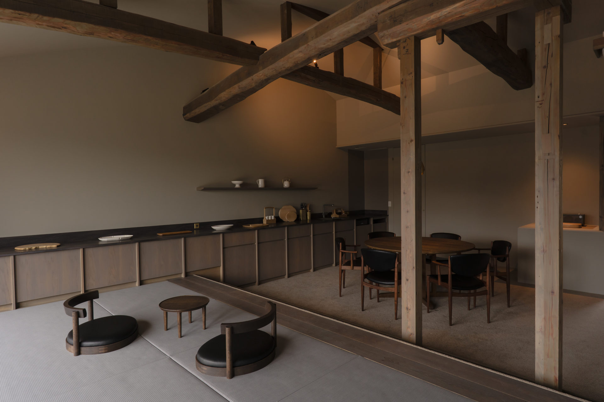 A quiet retreat set along the Daimon River, where rows of cherry trees line the banks. This villa was created not merely for the appreciation of craft, but for experiencing its beauty through everyday use. While engaging deeply with the woodcarving culture of Inami, Masanori Oji designed a space where displaying and using merge seamlessly into a single landscape. Reaching for a vessel or a tool, using it, and returning it to its place—within these simple gestures, the quiet joy of living with craft, OUKA, gently resides.